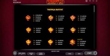 Онлайн-слот Chance Machine 5 Dice оснащен 5 барабанами в 3 ряда и имеет 5 фиксированных линий выплат. Диапазон ставок – от 0.05 до 100 монет. Выигрышными считаются те сочетания одинаковых символов, которые располагаются на соседних барабанах и начинаются с крайнего левого. Если на поле появляется 3 и более символов одного вида (для символа в виде цифры 7 достаточно 2 и более), к установленной ставке применяется множитель. Чем больше количество символов на поле, тем большее умножение можно получить. Максимальный коэффициент дает выпадение 5 символов в виде 7 – х1 000 к ставке!