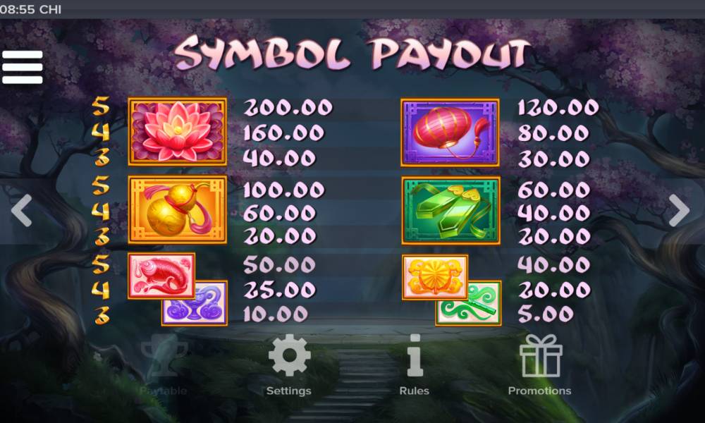 В Chi Slot представлены базовые и специальные иконки, тематический бонусный раунд, фриспины и другие призовые опции.