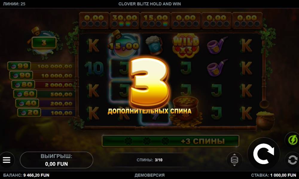 Джекпоты в Clover Blitz Hold and Win не реализованы, но при везении максимальный выигрыш составит х12000 от ставки.