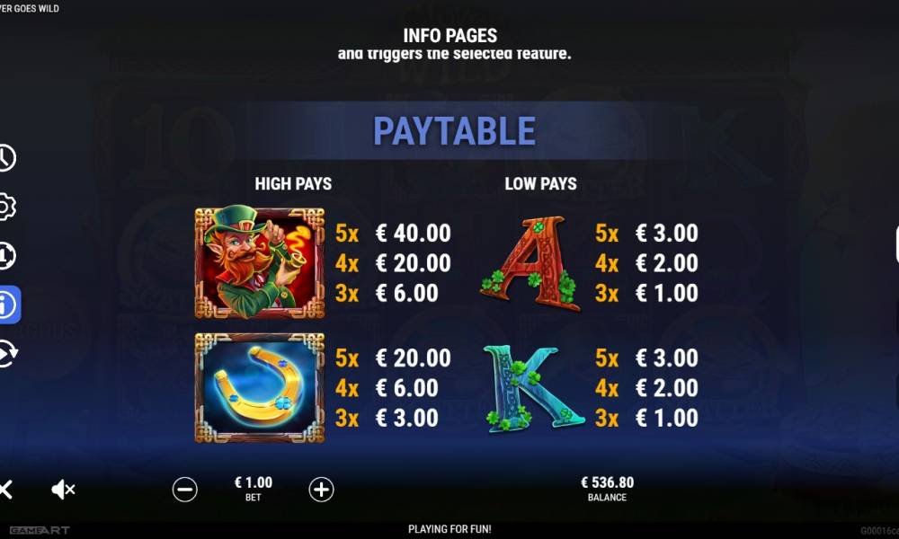 Наименее ценными являются карточные символы: десятка, валет, дама, король, туз. Выше оплачиваются кружка с пенным пивом, зеленая ирландская шляпа, курительная трубка и подкова, а самый ценный — мифический лепрекон. Размеры ставок — в широком диапазоне от 0,25 до 200 у.е.