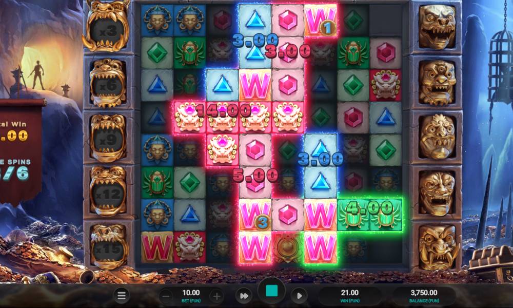 Free Spin Multiplier. Работает только во фриспинах. Дополнительный множитель появляется если разбить все Stone Block. Он повышается за каждое такое достижение на +х3 (первый раз х3, затем х6, и так далее), и сохраняется до конца раунда фриспинов.