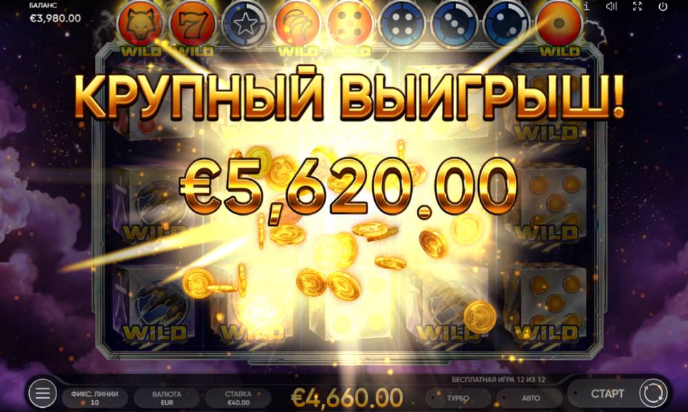 В игре Cyber Wolf Dice участвует 5 барабанов в 3 ряда с 10 фиксированными линиями выплат. Размер ставок находится в диапазоне 0.1-40 монет. Для создания выигрышной конфигурации необходимо, чтобы одинаковые символы расположились рядом, счет ведется от крайнего левого барабана. Если символов выпадает 3 и больше (в случае с символом Волк – 2 и больше), установленная ставка умножается на определенный коэффициент, значения которых приведены в таблице выплат. Максимальный множитель дает появление 5 символов Scatter – х250!
