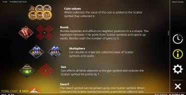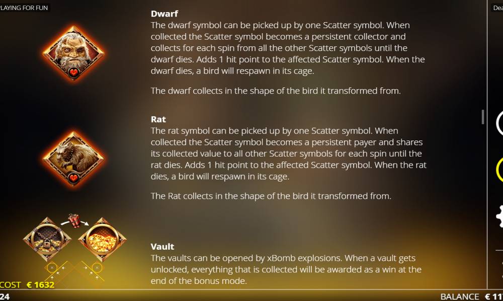 Dwarf — выпадая на поле, перемещается к ближайшей клетке. Будет собирать значения всех множителей с барабанов в себя при каждом спине, пока не закончатся жизни. Дает одно сердце канарейке.