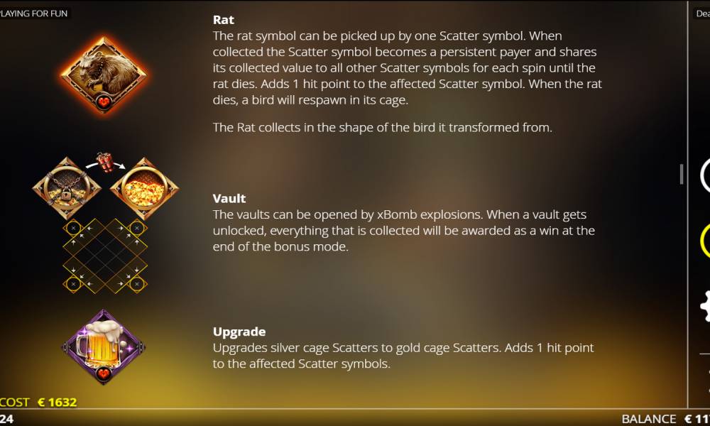 Gold cage Scatter Symbol — может приземляться на любом месте поля. Активирует раунд Canary Freespins. Он будет улучшенным, с более высокими наградами.