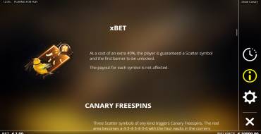Canary Freespins — это раунд с тремя бесплатными вращениями, который может быть активирован 3 любыми символами Scatter. Если участвует хотя бы один Gold cage Scatter Symbol, то игра будет более прибыльной. Теперь барабаны имеют вид 4-3-4-3-4-3-4, а по углам находятся 4 заблокированные позиции (хранилища). Они собирают в себя множители, которые появляются на поле. Но выплату хранилища дадут лишь в конце раунда, если будут разблокированы взрывом бомбы. Также на поле всегда есть три птицы в клетках. Они собирают в себя значения множителей. У птиц по три жизни. Бомба и газ забирают по одному сердцу. Когда птица умирает, она отдает в общий накопитель свое значение, а потом возрождается и начинает с х1. Игра идет до тех пор, пока возобновляются респины (каждый раз сбрасываются до трех при взрыве бомбы). В конце игрок получает выплату из общего счетчика и всех хранилищ, которые разблокированы.