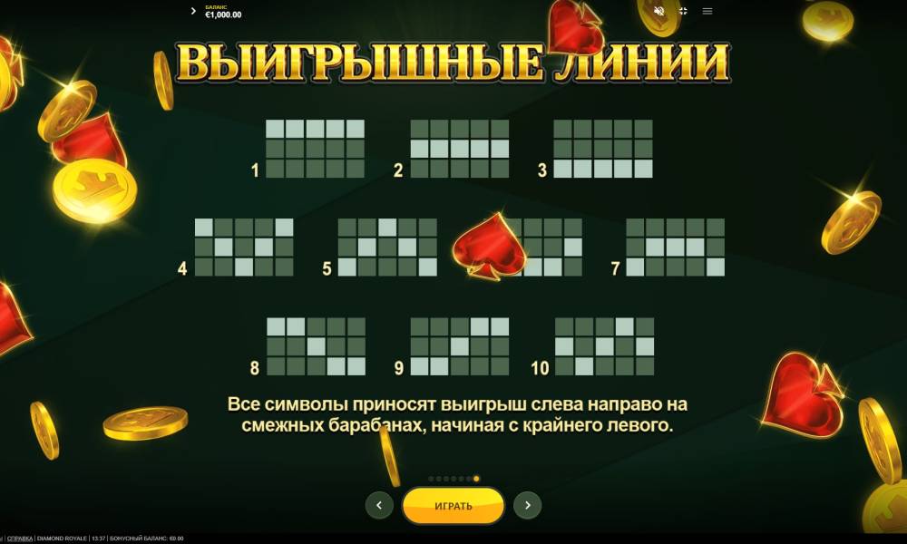 Игровое поле слота Diamond Royale от провайдера Red Tigerпредставлено 5 барабанами по 3 символа в каждом. Все выплаты осуществляются по 10 фиксированным игровым линиям.