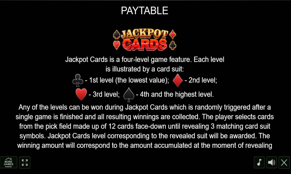 Раунд Jackpot Cards запускается в случайный момент. На поле появляются 12 карт, которые игрок должен переворачивать до тех пор, пока не найдет три одинаковых. Масть укажет на размер джекпота. Всего их предусмотрено 4 и шансы на получение каждого одинаковые. Все джекпоты прогрессивные, а значит не имеют фиксированного размера и всегда сбрасываются после выигрыша.