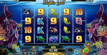 «Золото дельфина» имеет пять барабанов. На экране одновременно появляются двадцать картинок, расположенных в четыре ряда. Играть можно по одной – сорока линиям, задействовав любое их количество. Ставки по всем позициям всегда равны и могут быть от одного цента до двух евро, так что на раунд принимается не менее цента и не более восьмидесяти евро. Помимо простых картинок, в Dolphin Gold доступны особые символы с различными специальными возможностями, дополнительные множители, риск-игра по шансам и бесплатные вращения с расширенными опциями. Базовые изображения приносят выигрыши, образуя на активных линиях непрерывные цепочки из нескольких одинаковых элементов. Начинаться такие последовательности обязательно должны с крайне колонки слева. При этом выплата полагается лишь за самую ценную комбинацию по каждой позиции. Соответственно, количество выигрышных вариантов не может превышать число задействованных полос. Выплаты рассчитываются наиболее распространенным способом. Ставка, сделанная по линии, умножается за указанный в специальной таблице коэффициент сформировавшейся комбинации. Он бывает от х5 до х500 (без учета удвоений, о которых читайте ниже). Если цепочек несколько, выигрыши суммируются. Вы можете сразу забрать деньги или поставить их все на кон в игре по шансам. Она запускается на отдельном экране. Здесь нужно угадывать либо цвет, либо масть (выбор за вами) закрытой карты. Назовете правильно цвет – выплата удвоится. Угадаете масть – выигрыш увеличится в четыре раза. Действовать можно до пяти раз подряд, но при первой же ошибке вы лишитесь кредитов. В Dolphin Gold заложен теоретический возврат на уровне 95,303%.