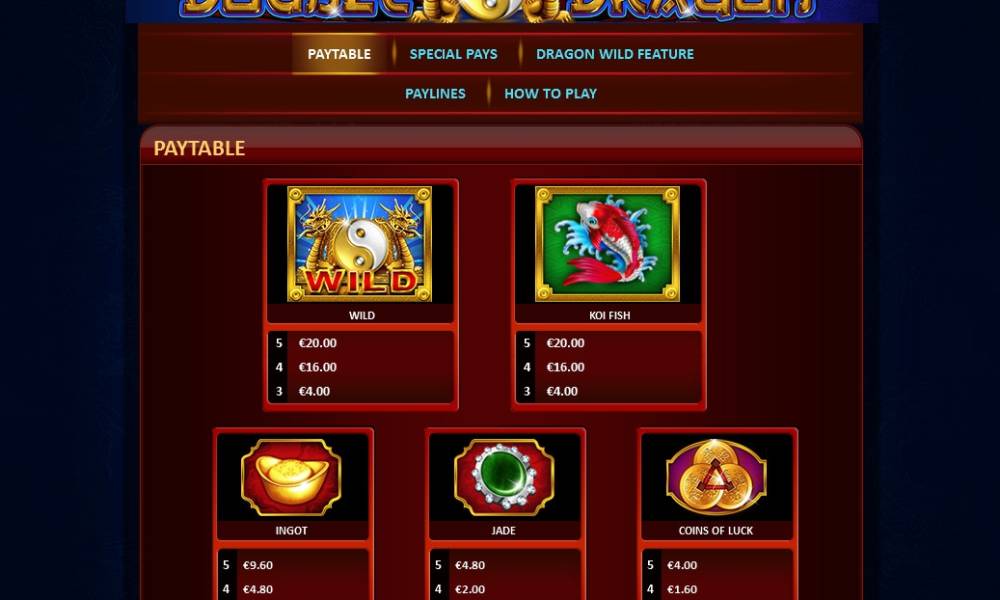 В Double Dragon пять барабанов, три ряда картинок на экране и двадцать пять постоянно задействованных активных линий, количество которых менять не разрешается. Играть на игровом автомате разрешается по ставке на линию от одного цента до двадцати евро. На раунд принимается до пятисот евро. Набор доступных опций включает в себя, помимо обычных символов, особые элементы с расширенными возможностями и прочие функции, которые рассматриваются ниже. Игры по шансам нет. Для формирования оплачиваемой цепочки обычным способом требуется не менее трех одинаковых картинок. Они должны оказаться рядом друг с другом на любой из активных линий, начиная с первого барабана слева. При этом засчитывается лишь старшая комбинация в каждой отдельно взятой последовательности. Сумма выигрыша зависит от двух факторов: ставки по линии и коэффициента комбинации, указанного в специальной таблице. Максимальный множитель равен х250. Общая выплата за спин по его завершению автоматически переводится на счет. Исключений из правил не так уж много. Все они рассматриваются в следующем разделе статьи. В Double Dragon заложен теоретический возврат 95,98% (официальная информация).