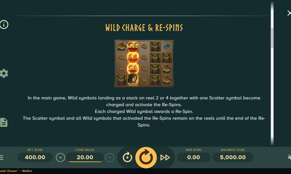 Далее в обзоре игрового автомата Druids’ Dream NetEnt на Casinoz рассказывается об особых символах и призовых опциях.