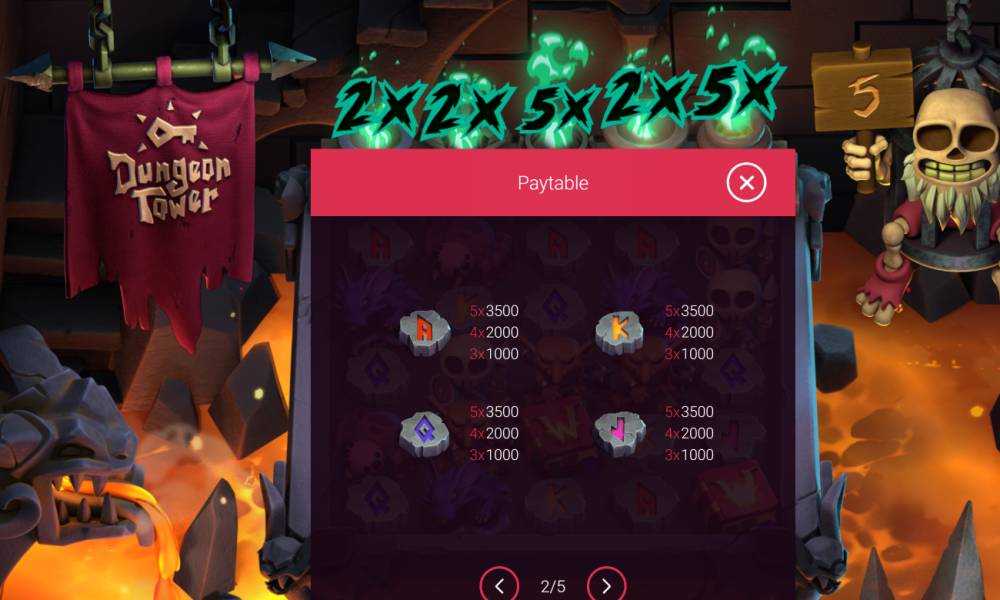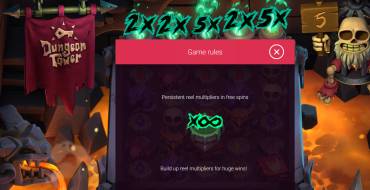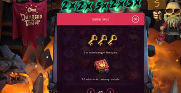 Dungeon Tower — это захватывающий онлайн слот с игровым полем 5x5 и 20 выигрышными линиями. Комбинации формируются из 3 и более одинаковых символов, стоящих рядом по горизонтали или вертикали. После каждого выигрыша активируется каскадная механика, убирая выигравшие символы и добавляя новые. Диапазон ставок предложен от 10 до 5000 монет. Максимальный выигрыш будет 20 000 множителей ставки. Акцент сделан на множителях и бонусных функциях, которые добавляют в игру невероятный азарт.