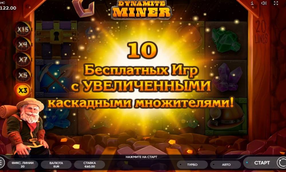 Видеослот Dynamite Miner подарит каждому запоминающийся игровой опыт и крупные выплаты. Играть в сопровождении пожилого золотодобытчика очень интересно. Взрывающиеся каскады и падающие символы обеспечивают на игровом поле постоянно меняющуюся ситуацию.