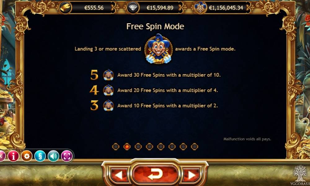 На экране слота появляется одновременно пятнадцать картинок. Набор предлагаемых опций состоит из базовых и особых картинок, фри-спинов, функции Hold и бонусного раунда, в котором можно выиграть призовые выплаты или один из трех прогрессивных джекпотов.