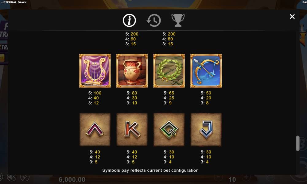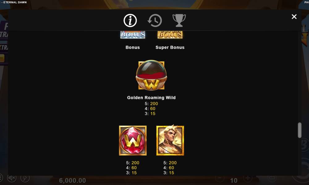 Игровое поле в слоте Eternal Dawn состоит из 5 барабанов, высотой в 4 ячейки. Никаких расширений не предусмотрено. На нем действует 30 фиксированных линий для составления комбинаций. Для выигрыша необходимо расположение минимум трех знаков подряд слева направо, либо с использованием джокера. Ставка устанавливается игроком, который выбирает из значений от 0.1 до 60 евро. Этого вполне достаточно при максимальном выигрыше в х6000. Волатильность немногим выше средней, соответственно и риски умеренные. В обычном игровом режиме действует лишь один бонус — Wild drop. Всего слот способен выставить 9 рядовых и 4 специальных символа.