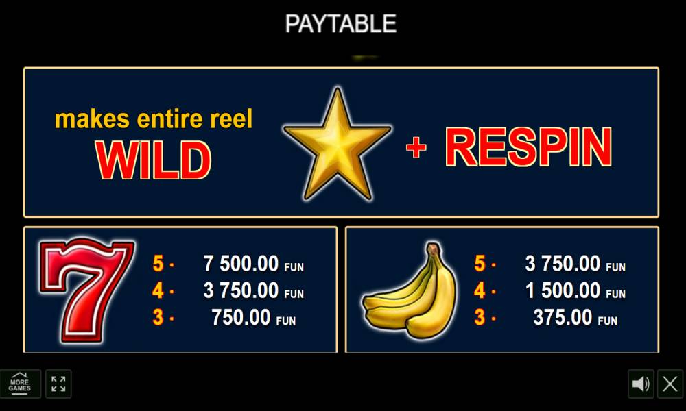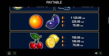 Игровое поле имеет формат 5х3. Линий для выплат фиксировано 10. Засчитываются комбинации из 3-5 символов, собранные с крайнего барабана в любую из сторон. Лимон, вишня, слива и апельсин — это младшие знаки автомата, а виноград, арбуз, банан и семерка — старшие. Бонусы аппарата представлены респинами, риск-игрой, джекпотами. В онлайн слоте большой диапазон ставок — 0.01-1000 евро и есть много вариантов. Максимальный выигрыш не может превышать поставленную сумму более, чем в 5000 раз.