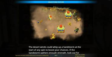 Sandstorm Bonus – В начале любого спина может начаться песчаная буря. Она способна принести дополнительные Wild, заполнить джокерами целые колонки, сформировать цепочки из пяти одинаковых картинок или даже начать бесплатные спины.