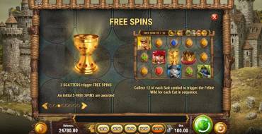 В обычных спинах на экране царит мир. Когда начинаются бесплатные вращения, котов охватывает ярость, и они вступают в бой. Замок пылает, летают стрелы, развеваются флаги и так далее.