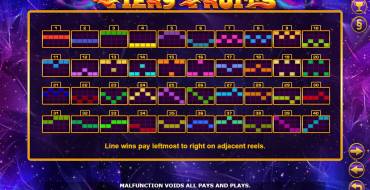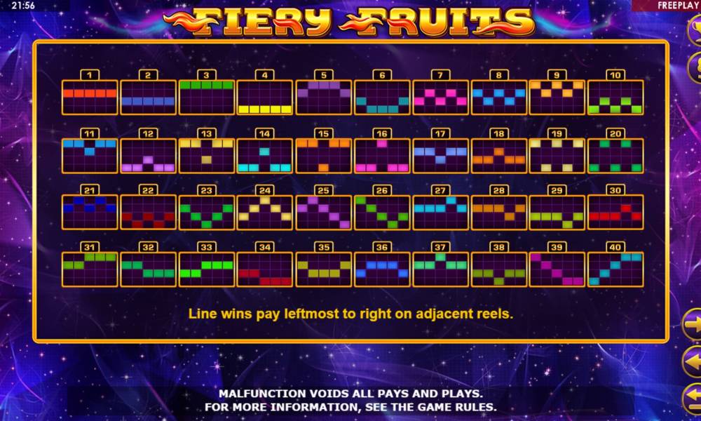 Игровое поле слота Fiery Fruits от провайдера Amatic Industries стандартное. Оно состоит из 5 барабанов по 4 символа в каждом. Выплаты производятся по 40 фиксированным линиями.