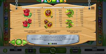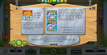 В слоте Flowers пять барабанов и тридцать линий. Вы можете самостоятельно выбирать количество линий и ставку на каждую из них , от одного цента до двух с половиной долларов.