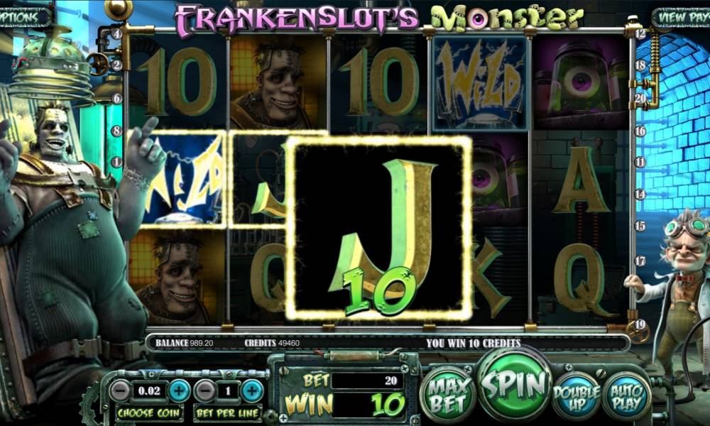 Запустив игровой автомат Frankenslot's Monster, вы увидите доктора Франкенслота, прототипа главного героя романа Мэри Шелли, сотворенного ним монстра, приборы из лаборатории, полную луну, а также номиналы карт от десятки до туза. Эти картинки являются базовыми, а особые функции выполняют следующие символы (вы узнаете их по надписям):