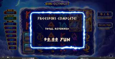 Бесплатные вращения. Активируются при появлении 3 и более символов Scatter. Количество фриспинов равно количеству выпавших скаттеров (минимум 3, максимум – 6). Если в процессе игры еще появляются Scatter, они увеличивают число фриспинов в следующей пропорции: за 1 символ – +1 вращение. В бонусном раунде падение одной части Зевса всегда означает толчок и появление второй части, что обеспечивает применение множителя (при наличии на поле хотя бы 1 золотой монеты). В раунде фриспинов Mega-приз разблокируется.