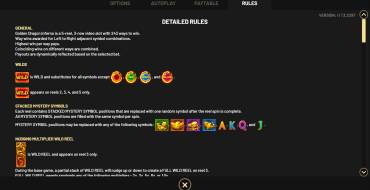 В игровом автомате Golden Dragon Inferno 5 барабанов по 3 ряда в каждом. Призовые комбинации составляются слева направо на 243 линиях для выплат (они фиксированные). Младшие знаки приносят вознаграждение за 3-5 штук, а старшие — за 2-5 одинаковых изображений. В каждой группе по 4 вида символов. Бонусы представлены множителями, респинами, джекпотами, расширяющимися знаками. Ставку на спин игрок может делать в диапазоне 0.25-80 евро. Максимальный выигрыш составляет х5000 от поставленной суммы.