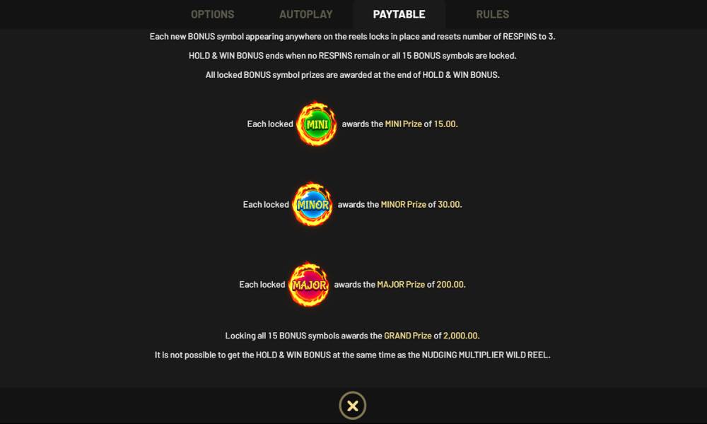 Чтобы получить Grand Jackpot, нужно заполнить все 15 ячеек бонусными символами. Тогда игроку сразу выплатится х2000 от ставки. Остальные джекпоты начисляются, когда они выпадают в виде огненных шаров на поле.