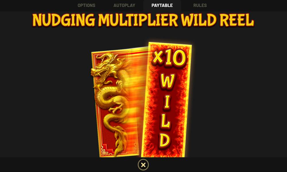 Nudging Multiplier Wild Reel. На третьем барабане выпадает дикий символ, который раскрывается на всю катушку. Он показывает случайный множитель — х2, х3, х5, х8 или х10. Multiplier применяется ко всем выигрышам за спин. Если же в раунде не было призовой комбинации, пользователь получает второй шанс. Третий барабан с драконом стоит на месте, а остальные вращаются. Вероятность, что игрок получит приз, повышается.