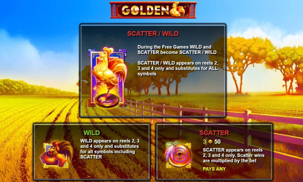 1. Wild (петух) есть на втором, третьем и четвертом барабанах. Он не оплачивается сам по себе, но при необходимости подменяет в цепочках другие символы, кроме скаттеров. Он способен заменять сразу несколько изображений.