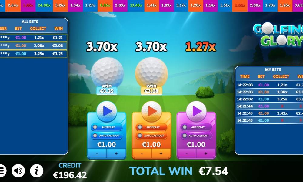 Golfing Glory — это онлайн слот, где нужно бросать мяч и ловить деньги. Как это сделать? Если три мяча. На каждый можно выбрать ставку в диапазоне 0.1-50 евро. Игрок вправе запустить 1, 2 или все 3 мяча и наблюдать за их полетом. После запуска начинается отсчет от множителя х1. Забрать приз нужно до того момента, пока мяч не упадет на землю. Для каждой ставки можно выбирать свой момент остановки. Если игрок успел вовремя схватить приз, то он будет сразу начислен. Если множитель над мячом загорелся красным, а человек не нажал «Забрать», то деньги сгорают. Самые удачливые люди могут получить приз х10000. Вверху отображается история, можно посмотреть, на чем останавливался каждый мяч в прошлых раундах.