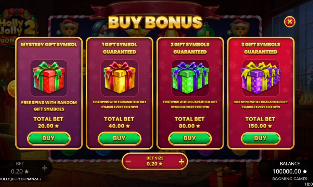 Buy Bonus. Магазин с 4 пакетами покупных фриспинов. За х100 ставки можно запустить обычные ФС. За х200, х400 или х750 можно запустить по 10 ФС с 1, 2 или 3 гарантированными Gift Symbol в каждом спине.