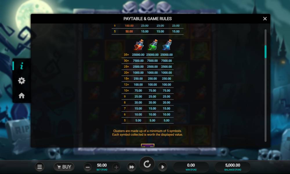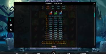 Слот работает по кластерной системе выплат: чтобы выиграть, 5+ знаков должны упасть одной группой с «соединением» знаков по вертикали или горизонтали. Символы, чьи ячейки касаются с группой только по диагонали, любым из углов — в кластер не входят. При любой выплате запускается каскад, но необычный: на поле остаются ячейки, где были выигравшие символы, срабатывает функция Mystery Feature, а остальные знаки удаляются с поля и на их места падают новые. Размер минимальной ставки очень маленький и составляет всего 0.10. Максимальная ставка равна 50 евро (или той валюты, которая принята за основную в казино). Выигрыш ограничен множителем х20000. Такую выплату можно поймать только во фриспинах, собрав на 35+ ячейках самый старший символ и добавив к нему несколько дополнительных множителей.