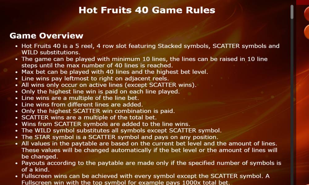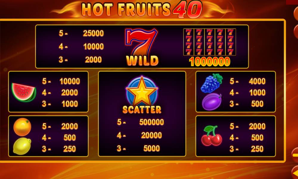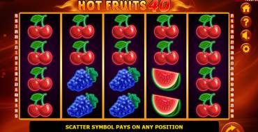 Игровой автомат Hot Fruits 40 отлично утоляет азарт и подходит всем людям за счет своей простоты и легкости. Но он требует хороших вложений. Нужно иметь солидный банкролл, чтобы начать игру. Отдача хоть и начинается быстро, но все-таки проигрыши и выигрыши сменяют друг друга нерегулярно.