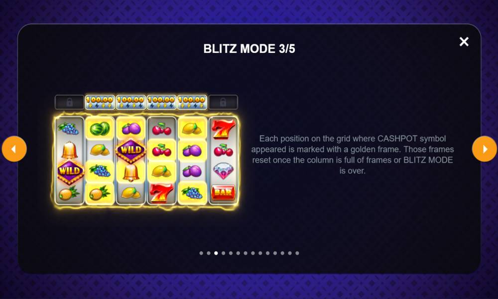 Blitz Mode. Над барабанами 2-5 включительно в простой игре и над всеми во фриспинах есть счетчики с 4 ячейками. Каждый раз при появлении символа Cashpot этот режим активируется. Сумма с символа добавляется в счетчик, и заполняется та пустая ячейка, на какой высоте выпал знак (например, если символ Cashpot приземлился на самой верхней ячейке 3-его барабана, над этим барабаном заполнится крайняя левая ячейка). Запущенный Blitz Mode активен 3 следующих вращения. Если за них выпадет хотя бы 1 знак Cashpot на любой ячейке — респины обновляются до 3. Если ни одного Cashpot не упадет — режим выключается, и счетчики пустеют. Выплаты, накапливаемые на счетчиках, выплачиваются, когда заполняются все 4 ячейки.