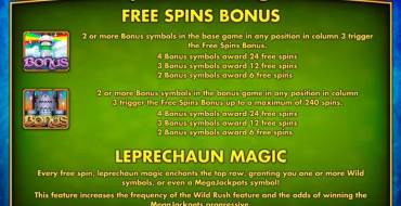 Классических бонусных игр и риск-игры в слоте нет. Имеется функция Second Chance, которая предоставляет игрокам дополнительную возможность выиграть джекпот после основной игры. Функция Leprechaun Magic превращает определенные символы в джокеры, обеспечивая игрока призами и выигрышами.