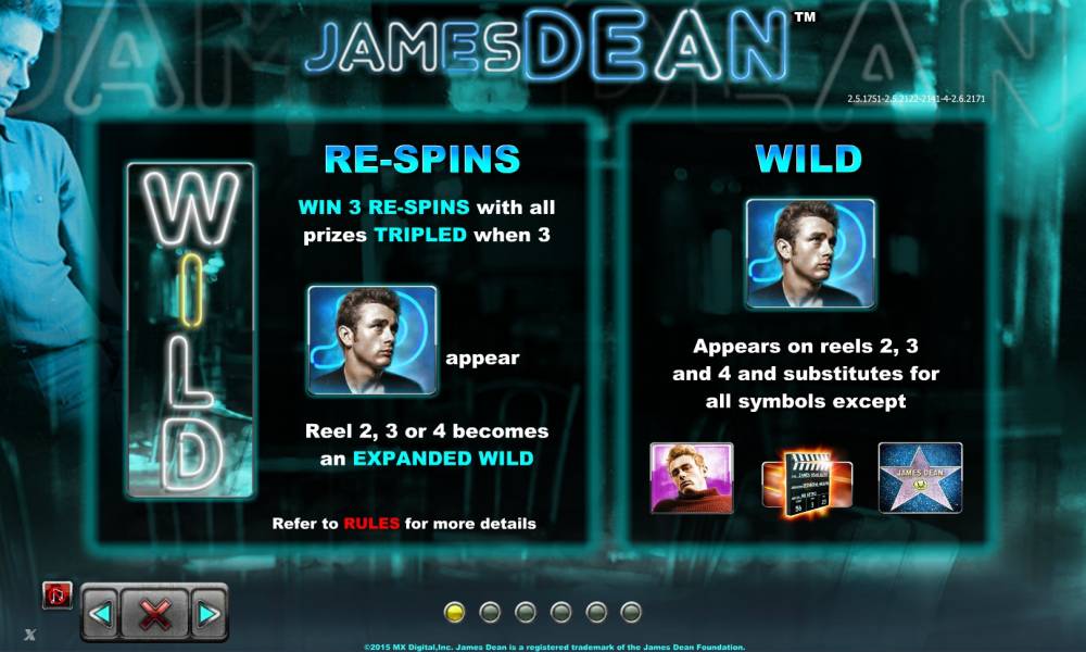Разработчики из NextGen делают все возможное, чтобы их видео-слоты были понятны всем без исключения игрокам на любом языке. Так, на панели управления почти нет надписей, а все кнопки интуитивно понятны. Размер ставки на линию вы сможете указать в левом нижнем углу экрана. Кнопка начала спина располагается справа. Она же останавливает барабаны раньше срока. Таблицу выплат с коэффициентами и правилами открывает кнопка i. Настройки ограничены возможностью отключить звук и развернуть окно на весь экран. Есть режим автоигры. Модель открывается в браузере, поэтому скачивать ее вы не будете. В информационной строке появляются не только актуальные данные по игре, но также цитаты из фильмов с участием Джеймса Дина, что наверняка понравится многим его фанатам.