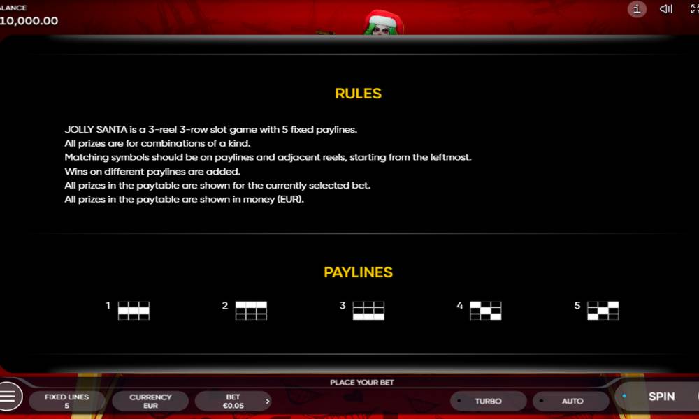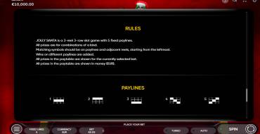 Онлайн-слот Jolly Santa имеет 3 барабана в 3 ряда и 5 фиксированных линий выплат. Выигрышные сочетания компонуются из трех одноименных символов, расположенных на соседних барабанах начиная с крайнего левого. Диапазон ставок – от 0.05 до 80 евро. Кроме того, комбинации из 3 одинаковых символов дают право на применение множителя к ставке. Его размер зависит от вида символа, все возможные значения приведены в таблице выплат. Максимальное умножение х50 к ставке сулит выпадение 3 символов Wild.