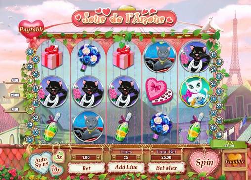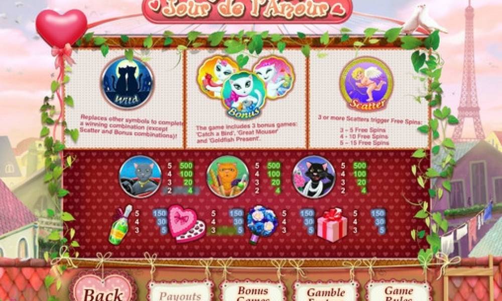 Не желаете провести день в Париже в обществе местных кошек, которых охватили любовная лихорадка? Да, предложение не самое заманчивое, если учесть, как себя ведут влюбленные коты. Но речь идет не о настоящей поездке, а о забавном видео-слоте Jour de l’Amour («День любви»), посвященном таким вот персонажам. Этот бесплатный игровой автомат онлайн выпустила известная компания GamesOS, ранее известная как CTXM, а портал Casinoz подготовил для вас его подробный обзор с описанием всех функций и возможностей.
