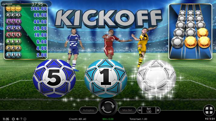 Игровой процесс модели Kickoff напоминает геймплей виртуальных скрэтч-карт, реализованный в оригинальной форме. Цель – получить три одинаковых мяча. Они формируют комбинацию, которая оплачивается по коэффициентам из специальной таблицы. Также предусмотрены другие способы начисления выигрышей, включая бонусы и раунд на удвоение. Ставка на раунд может быть от десяти центов до ста долларов. Коэффициенты варьируются от х2 до х200. Данные об уровне теоретического возврата производитель не предоставляет. Ход игры При запуске модели на экране появляются три футболиста, перед которыми лежат мячи. Выбрав желаемый размер ставки, игрок нажимает кнопку старта нового раунда, после чего футболисты наносят удары. Мячи останавливаются в передней части экрана, окрашиваются в разные цвета и на них появляются цифры от одного до семи (также есть особые элементы, о которых рассказывается ниже). Если формируется комбинация из трех одинаковых картинок, по ней начисляется выплата. Она рассчитывается по коэффициентам. Далее можно забрать выплату или запустить игру по равным шансам. Она выдержана в стиле «угадай цвет карты». Думаем, правила вам хорошо известны. Каждый удачный ход удваивает выигрыш.