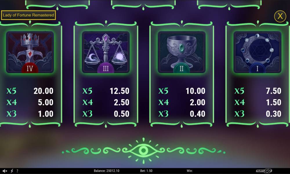Игровое поле в Lady of Fortune Remastered состоит из 5 барабанов, в 3 ячейки высотой каждый. Для составления комбинаций используется 15 фиксированных линий. Ставка выбирается среди готовых вариантов в диапазоне от 0.15 до 60 евро, но он может быть увеличен исходя из целевой аудитории казино. Всего во вращениях барабанов принимают участие 7 обычных и 2 специальных знака. Фриспины в слоте отсутствуют, их заменяет бонусная игра "Угадай карту" с моментальными выплатами.