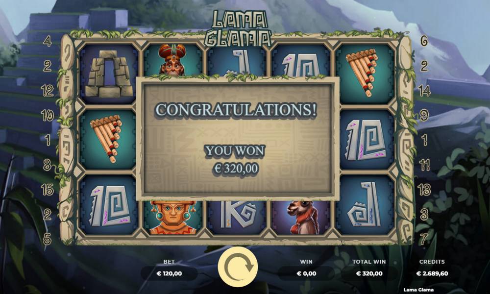 Аппарат Lama Glama V2 имеет 5 барабанов по три ряда и 15 линий для выплат, которые регулировать нельзя. Комбинации составляются от трех символов (исключение самый дорогой, он платит за 2 и более штуки) слева направо. Собирать знаки нужно четко с крайнего барабана подряд. Обычные символы выполняют роль специальных (всего по 5 видов старших и младших), а из особенных только Лама. Есть фриспины, а вот другие бонусы отсутствуют. Диапазон ставок 0.15-120 евро с большим количество вариантов.