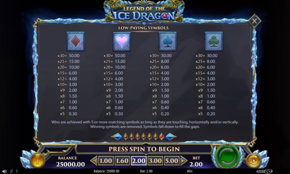 Слот Legend of the Ice Dragon от провайдера Play'n Go имеет классическое игровое поле, которое состоит из 7 барабанов по 7 символа в каждом. Все выплаты осуществляются по системе Cluster Pays.