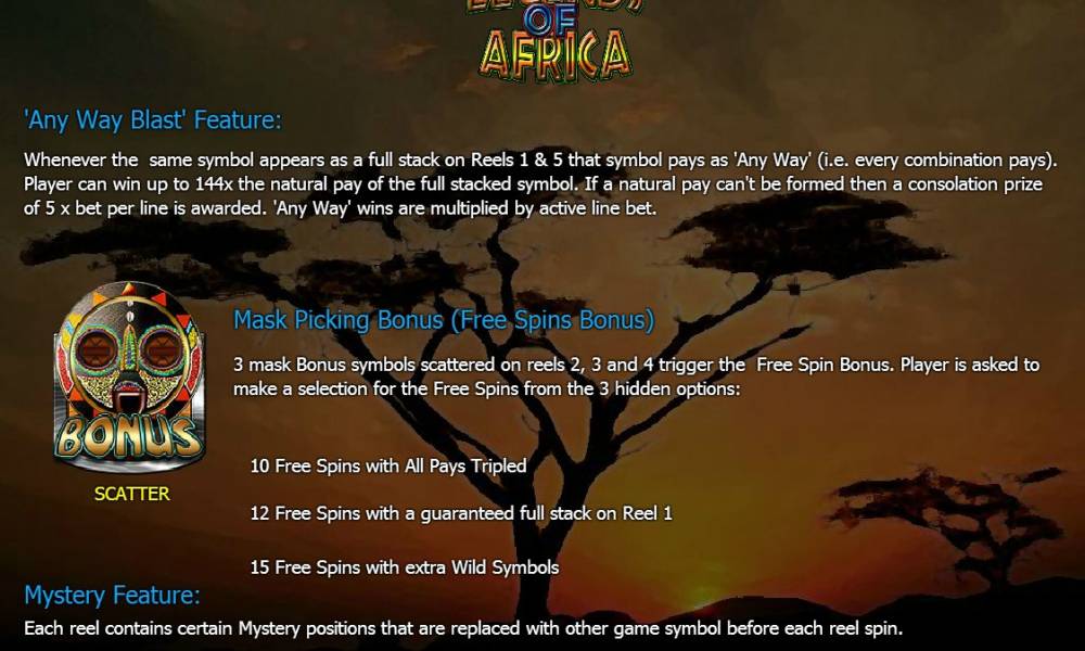 Legends of Africa представляет собой онлайновый игровой аппарат с пятью барабанами. Колонки на экране имеют разную высоту. В первой и пятой одновременно можно увидеть по две картинки, во второй и четвертой – по три символа, а в третьей – пять элементов. Соответственно, сразу вы увидите пятнадцать изображений, располагающихся в виде ромба. В игре тридцать линий для формирования на них оплачиваемых комбинаций. Все они задействованы по умолчанию, и менять их количество нельзя. Ставки по полосам равны. На каждую принимается до двадцати монет достоинством 0.01, 0.02, 0.05, 0.10 или 0.20 долларов. Таким образом, на спин принимается от тридцати центов до ста двадцати кредитов. Набор предлагаемых в «Легендах Африки» игровых опций состоит из базовых картинок, особых символов, уникальной функции Any Way Blast, бонусного раунда Mystery и фри-спинов Mask Picking с дополнительными возможностями. Все они рассматриваются далее в статье. Простые картинки приносят выигрыши, когда образуют на активных линиях непрерывные последовательности из двух (для некоторых нужно от трех) и более одинаковых предметов. Начинаться цепочки обязательно должны с первой колонки слева. Только самый ценный вариант по каждой полосе принимается в расчет. Размер выплаты определяется по двум показателям: ставки на линию и коэффициента полученной комбинации. Он бывает от х5 до х500. Расчет производится перемножением данных параметров. Если цепочек сразу несколько в одном спине, что бывает очень часто, начисленные кредиты суммируются. В Legends of Africa нет игры по равным шансам, поэтому все деньги выводятся на счет после остановки барабанов автоматически. Все исключения из общих правил и особые функции рассматриваются ниже. Данных о теоретическом возврате модели у нас пока нет.