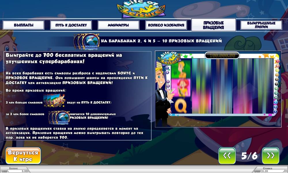 Игровой автомат Life of Leisure имеет 5 барабанов.