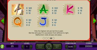 В Long Pao выиграть можно если минимум 3 знака приземлятся на любую из 25 фиксированных линий. На каждую из них можно поставить не менее 0.01 евро (или других валют), то есть минимальная ставка за 1 спин составит 0.25. А максимальная ставка ограничена на отметке 200. Выиграть же можно не более чем х3000. Игра ведется на небольшом поле 5х3.