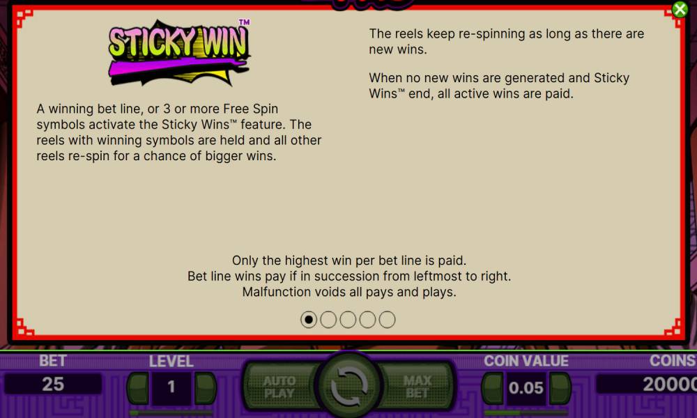Sticky Win. Запускается при появлении 3 знаков Free Spin или при любом выигрыше. При активации знаки, которые выиграли, остаются на своих местах, а для остальных запускается респин. Если после респина на поле сложится любая выигрышная комбинация (к предыдущей добавится хотя бы 1 знак, или другие символы сложатся на другой линии), респин повторяется. Функция работает до тех пор, пока после респина продолжают выпадать новые выплаты.