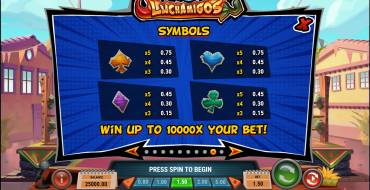 В слоте Luchamigos всего 9 символов, 6 обычных и 3 специальных. Игровое поле 5х4 с 1024 линиями для составления комбинаций. Размеры ставки обычно выбираются из диапазона от 0.1 до 100 у.е.. Примечательно, что фриспины и бонусы активирует символ Scatter. Максимальный выигрыш ограничен х10000. Учет комбинаций осуществляется слева направо, от 3 одинаковых знаков.