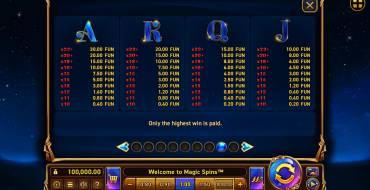 Изучив особенности слота и его функционал, вы сможете начать платить реальными деньгами и получать настоящие выигрыши. Игровой автомат Magic Spins есть в разных онлайн-казино в списке ниже. Все они имеют лицензии и гарантируют честную игру. Перед игрой загляните в таблицу выплат, где много информации о выигрыше комбинации.