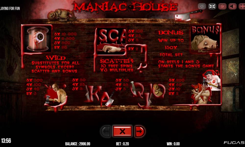 Игровой автомат Maniac House имеет пять барабанов, двадцать фиксированных полос и пятнадцать ячеек для символов на основном экране. На линии разрешается делать одинаковые ставки. Принимается до десяти монет каждую. Их номинал уточняйте в онлайн-казино. На сайте разработчика в демо-версии чипы могут стоить от одного цента до десяти долларов (0.20 – 2000 долларов на спин). В слоте доступны восемь базовых иконок, три особых символа, игра на удвоение, фри-спины с множителями и бонусный раунд. Обычные иконки составляют выигрышные цепочки из нескольких одинаковых элементов. Они должны расположиться непрерывной последовательностью на активной линии, начиная с первой колонки. Всегда учитывается только максимальный вариант по каждой полосе. Для расчета выплат используются коэффициенты от х2 до х10 000. Они умножаются на ставку по линии. Об исключениях читайте ниже в обзоре Maniac House. Если комбинаций больше одной, выигрыши суммируются. Раунд на удвоение запускается по желанию клиента. Его можно начать при любой выплате. На кон принимаются 100% или 50% начисленной суммы. Игра проходит в стиле сравнения карт. Победа над виртуальным дилером означает, что выигрыш удвоится. Проигрыш лишает ставки, а ничья оставляет стороны при своих. О бонусах рассказывается далее в статье.