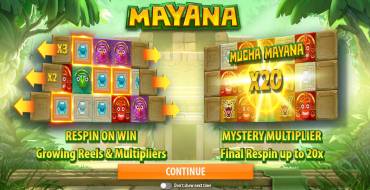 В видео-слоте Mayana пять барабанов, но с началом спина доступны лишь три из них. В колонках помещаются по три картинки. Активные линии отсутствуют. Ставка на раунд кратна двадцати пяти и колеблется от 0.25 до 100 евро. В игровом аппарате используются восемь базовых картинок. Они составляют оплачиваемые последовательности, оказываясь в любых ячейках соседних колонок. Комбинации образуются, начиная с любого столбца. Выигрыши рассчитываются по коэффициентам от х4 до х150, которые умножаются на стоимость условных чипов (1/25 часть общей суммы на кону). Если цепочек несколько, начисленные кредиты суммируются. При образовании комбинаций запускаются «расширяющиеся респины» (Expanding Respins). Детальнее повторные вращения и другие бонусы игрового автомата «Майяна» рассматриваются далее в обзоре Casinoz. Количество доступных способов начисления выплат колеблется от 27 до 243. Оно зависит от числа иконок на экране. Игры на удвоение в данной модели нет.